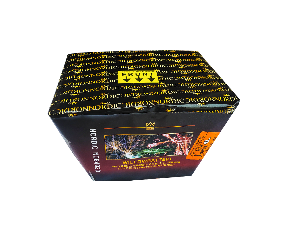 49-skuds willow-batteri, der skyder op i en vifte med røde, grønne og blå stjerner, der eksploderes som store chrysanthemumbomber.